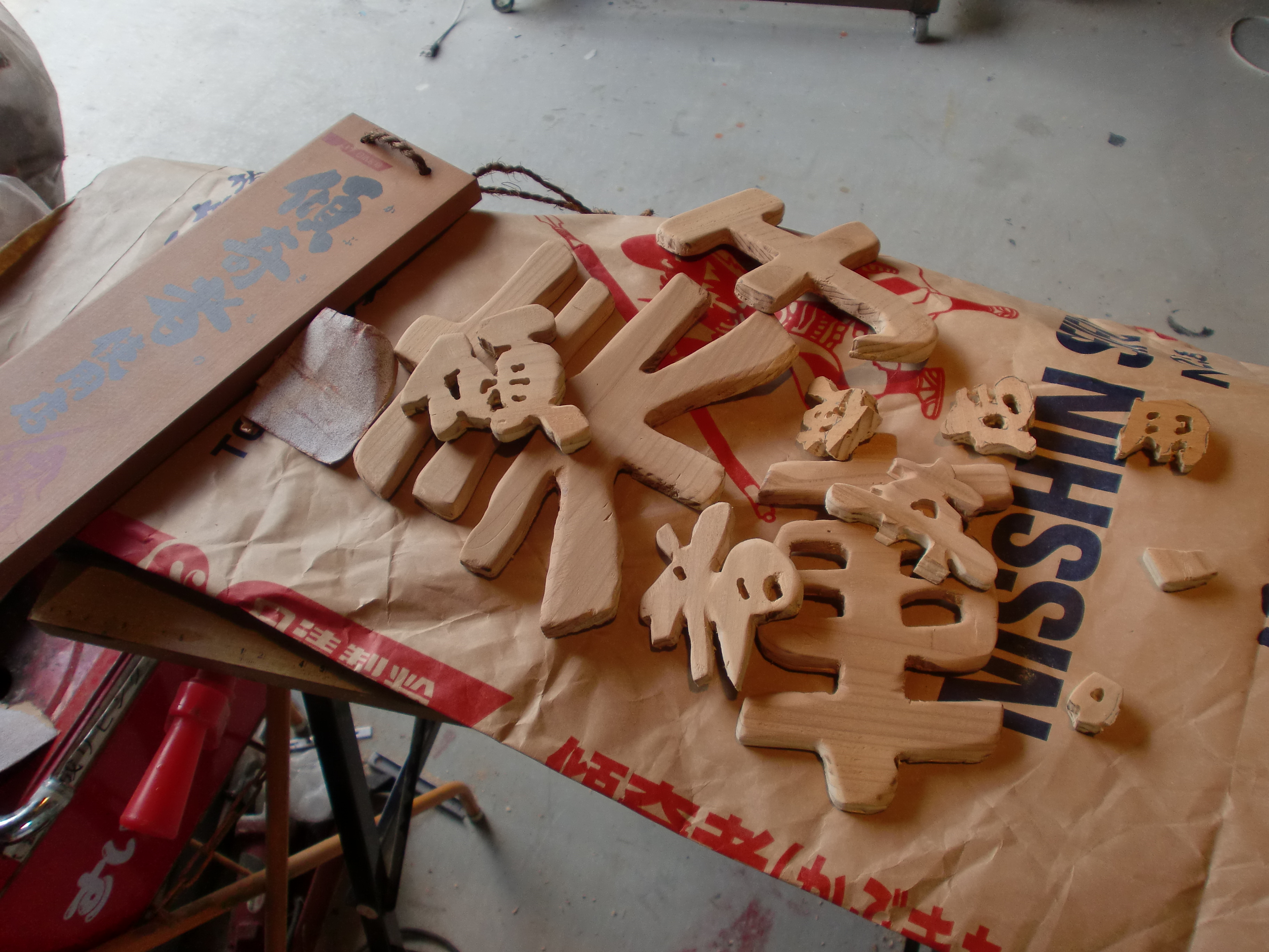 ベースは懸垂幕のフレームだった物を再利用!いい感じにグレーに枯れてますのでいつも通り彫るわけにもいかず、考えついたのがこの方法です