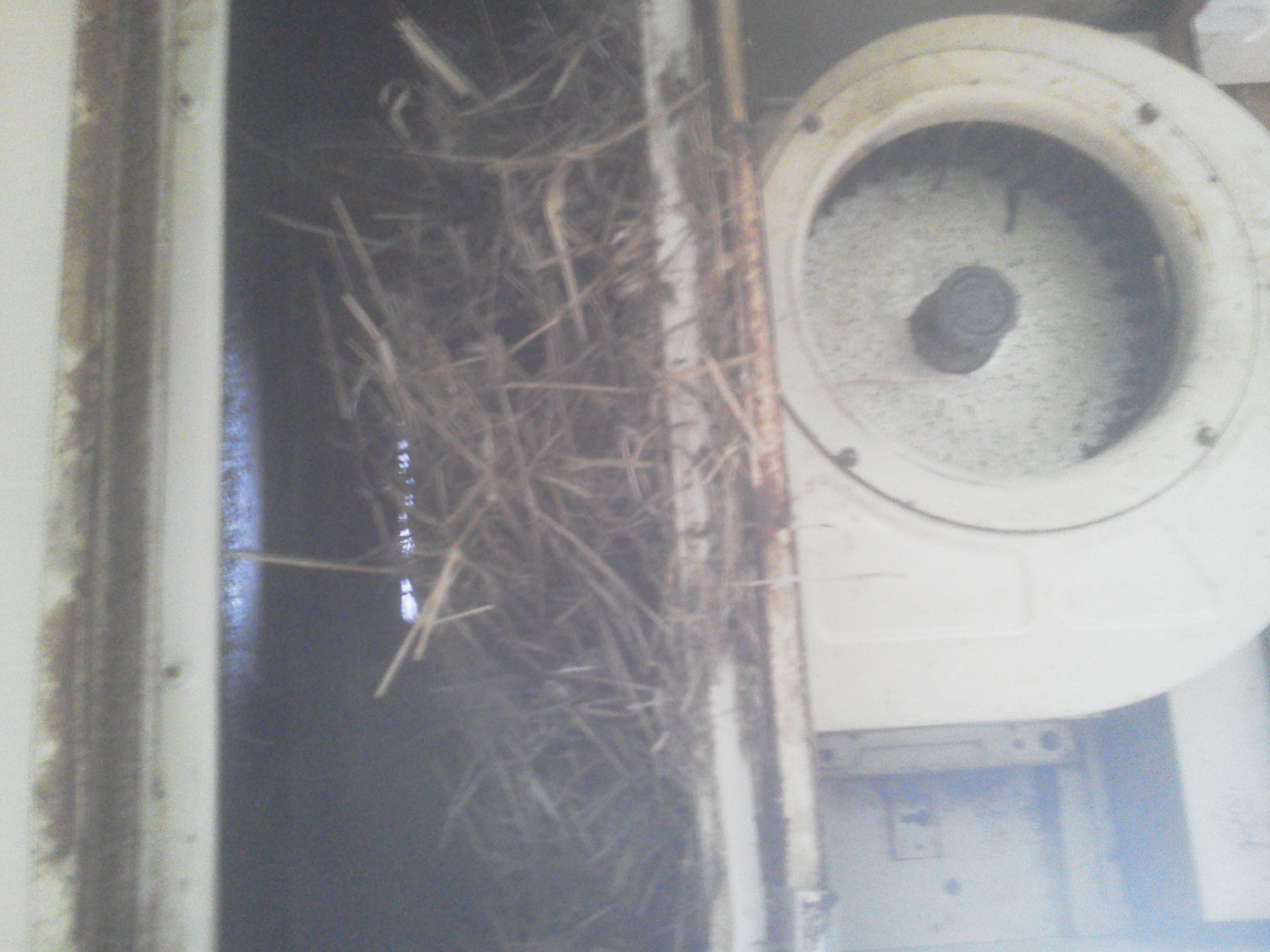 これちょっと見にくいのですが、写真左が上で右が下です、キッチンの換気扇の上に必要以上の開口がしてあり、なおかつフードカバーになんのネットらしき物もないので鳥が一生懸命巣を作った!という一コマです。
