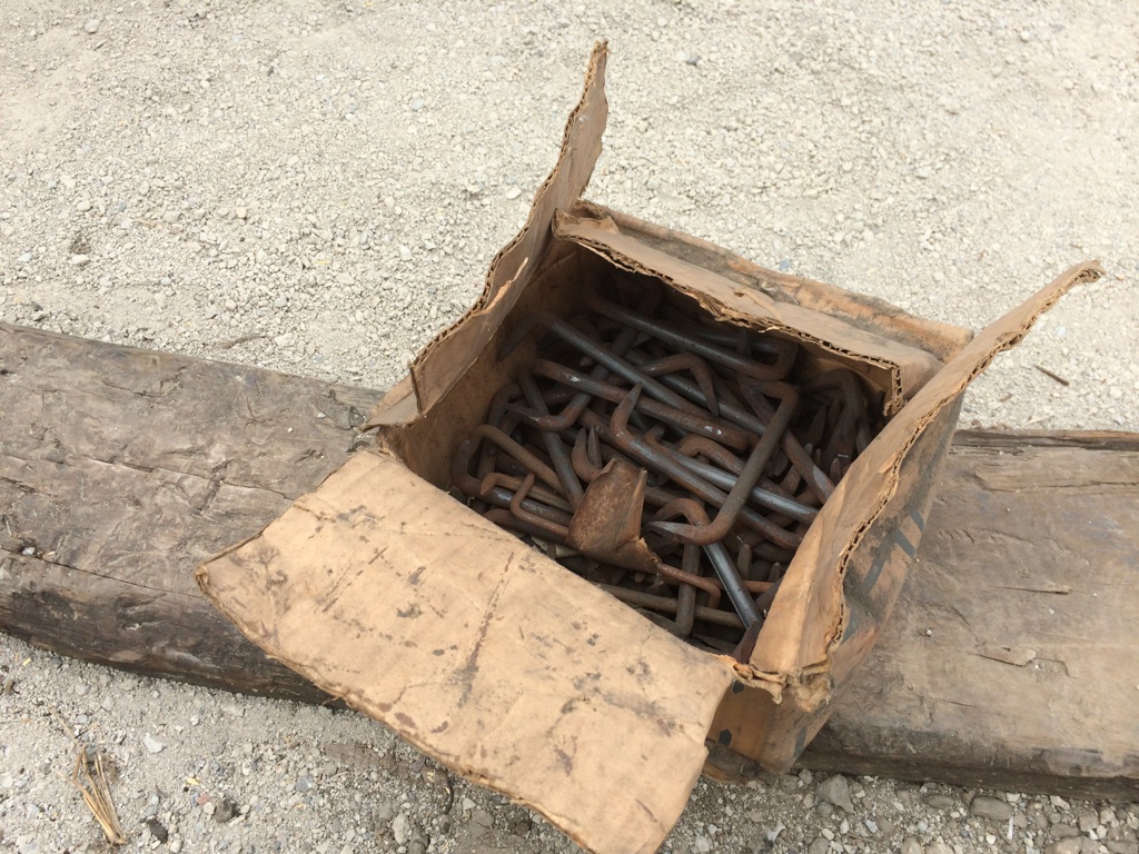 東京ベースの入り口にはアメリカの田舎にある様な風景を作りたくて枕木を敷き詰めたんだけど、かすがいだけが妙に新しくて古い物を探していたら、いつもの金物屋さんの売れず後家?デッドストック?
